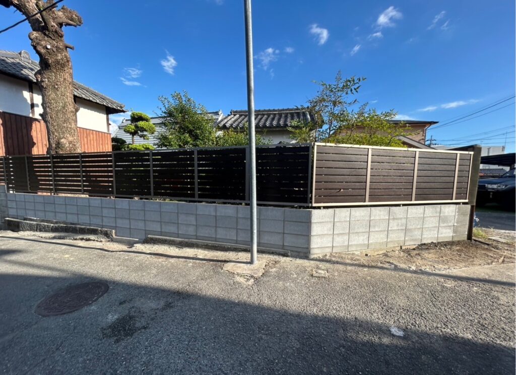現在の建築基準法では、ブロック塀高さ(フェンス含む)2200mm以下となっており、急遽ブロック塀の解体工事から新設ブロック積み目隠しフェンスまで設置さして頂きました。フェンスは木目が綺麗なフェンスAB YS3型 シャイングレー+クリエダークで目隠しだけでなくオシャレな雰囲気を創り出せました。